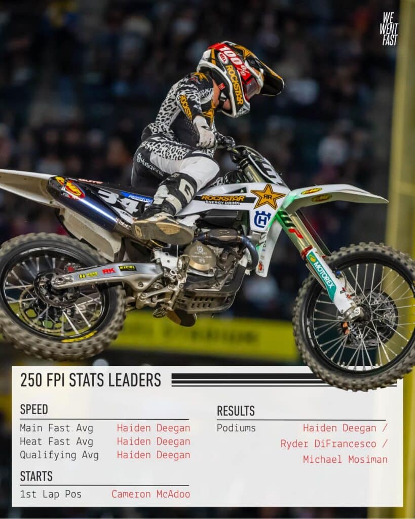 - Haiden Deegan has delivered nearly unmatched speed this season. He’s been fastest qualifier 2 of 3 rounds, fastest overall in the heats all 3 rounds, and fastest in the main 2 of 3 times. No surprise he moves up 2 spots to top the FPI after 3 rounds. The only weakness is 1st lap position (12-3-4). His competition best hope he doesn’t start uncorking holeshots!